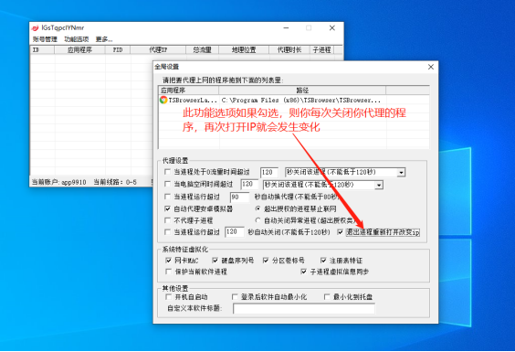 反之不勾选此选项,你关闭所代理的程序再次打开,IP还是上次代理的IP,不会发生变化。需要发生变化的话则需要代理程序以及我们的软件全部关闭,重新代理使用才会改变。